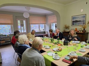 Am 22. Oktober 2025, 10 Tage nachdem der Heimatverein Pätz e.V. die von ihm gestiftete Gedenk-Stele für Angelika Schrobsdorff eingeweiht hatte, kam lieber Besuch in den Hörningweg. Peter Schrobsdorff, der Sohn der Schriftstellerin, besuchte uns im zukünftigen Dorfgemeinschaftshaus, dem Sommersitz seiner Vorfahren. Da er am 11.10. bei der Enthüllung der Stele leider verhindert war, holten wir die Feierlichkeit im kleineren Kreis nach. Zu den Gästen an der Kaffeetafel gehörten Peter Schrobsdorff, Siegrid und Dr. Jürgen Scheibe, Brigitte und Klaus Lehmann-Dreistadt, sowie drei Mitglieder des Heimatvereins. Zudem kamen noch vier Überraschungsgäste aus Klausdorf. Schnell kamen alle bei Kaffee und selbstgebackenem Kuchen in einen interessanten Austausch, bei dem nicht nur Literatur das Thema war.