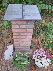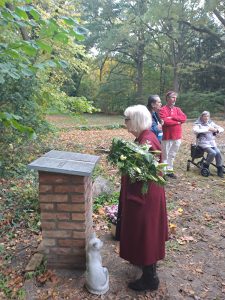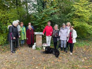 Nach dem Kaffee besuchten wir die Stele gedachten Angelika Schrobsdorff mit Zitaten über Pätz und dem Niederlegen eines Gesteckes mit einer Schleife, auf der steht: „In großer Verehrung – die Bücherfreunde vom Mellensee“. Die Anwesenden äußerten sich ausnahmslos positiv zu Form und Botschaft der Gedenkstätte. Peter Schrobsdorff fand, dass sie in Aussehen und Inhalt gut zu seiner Mutter passt. Als er einige Familienerinnerungen mit uns teilte, stellte er fest, dass Angelikas Großvater, Daniel Kirschner, taggenau seinen 87. Todestag hat. Welch ein Zufall.