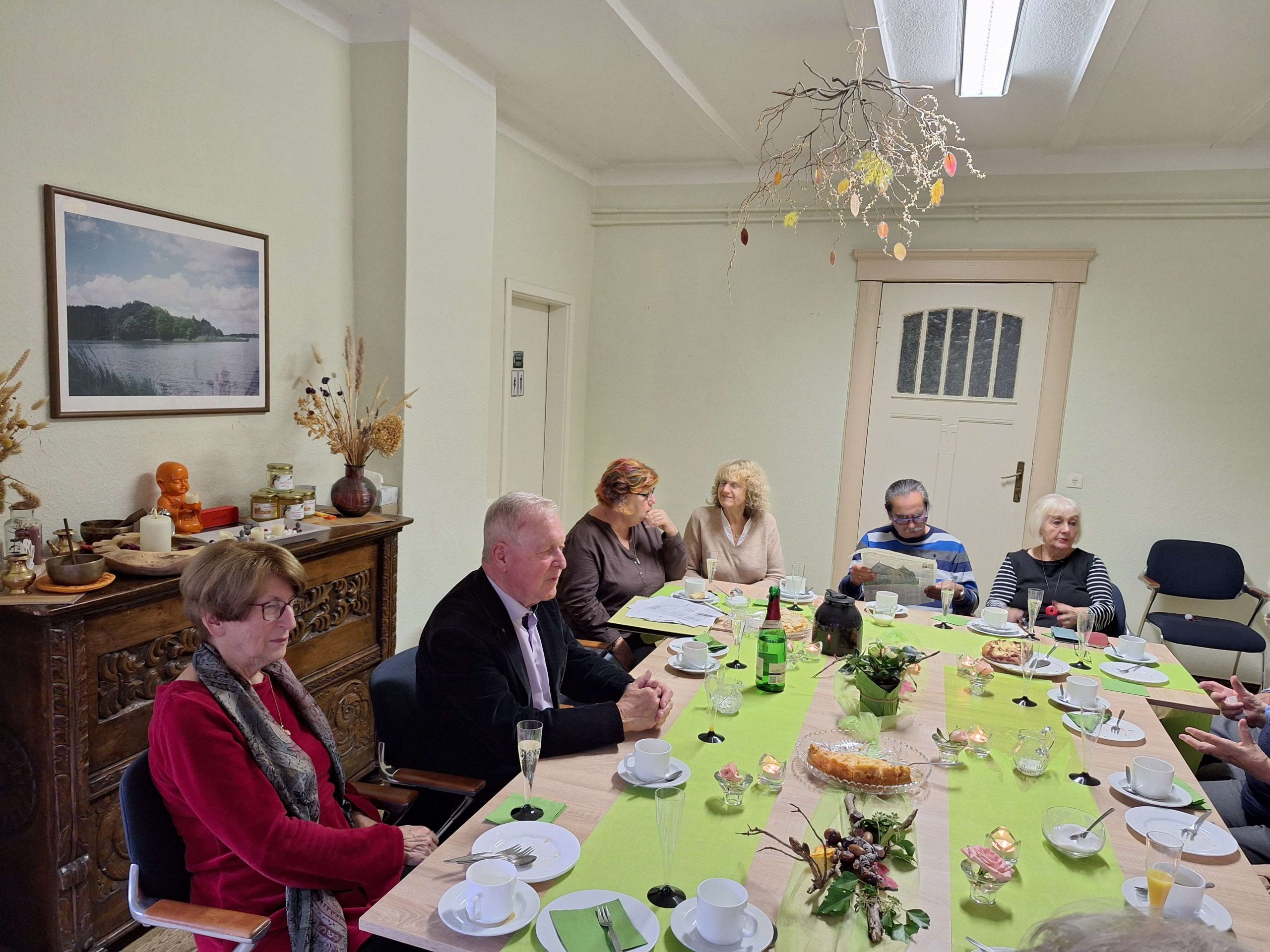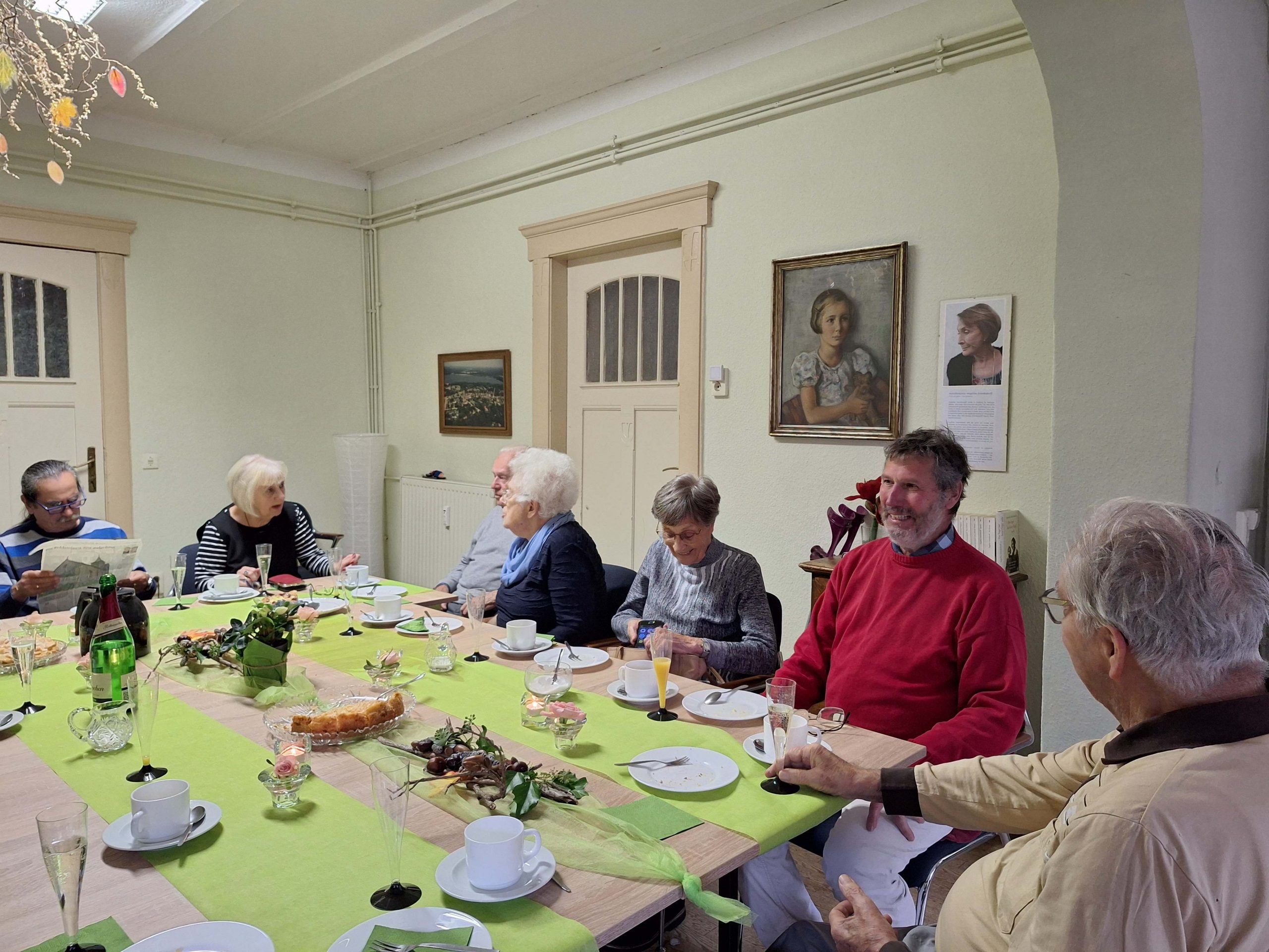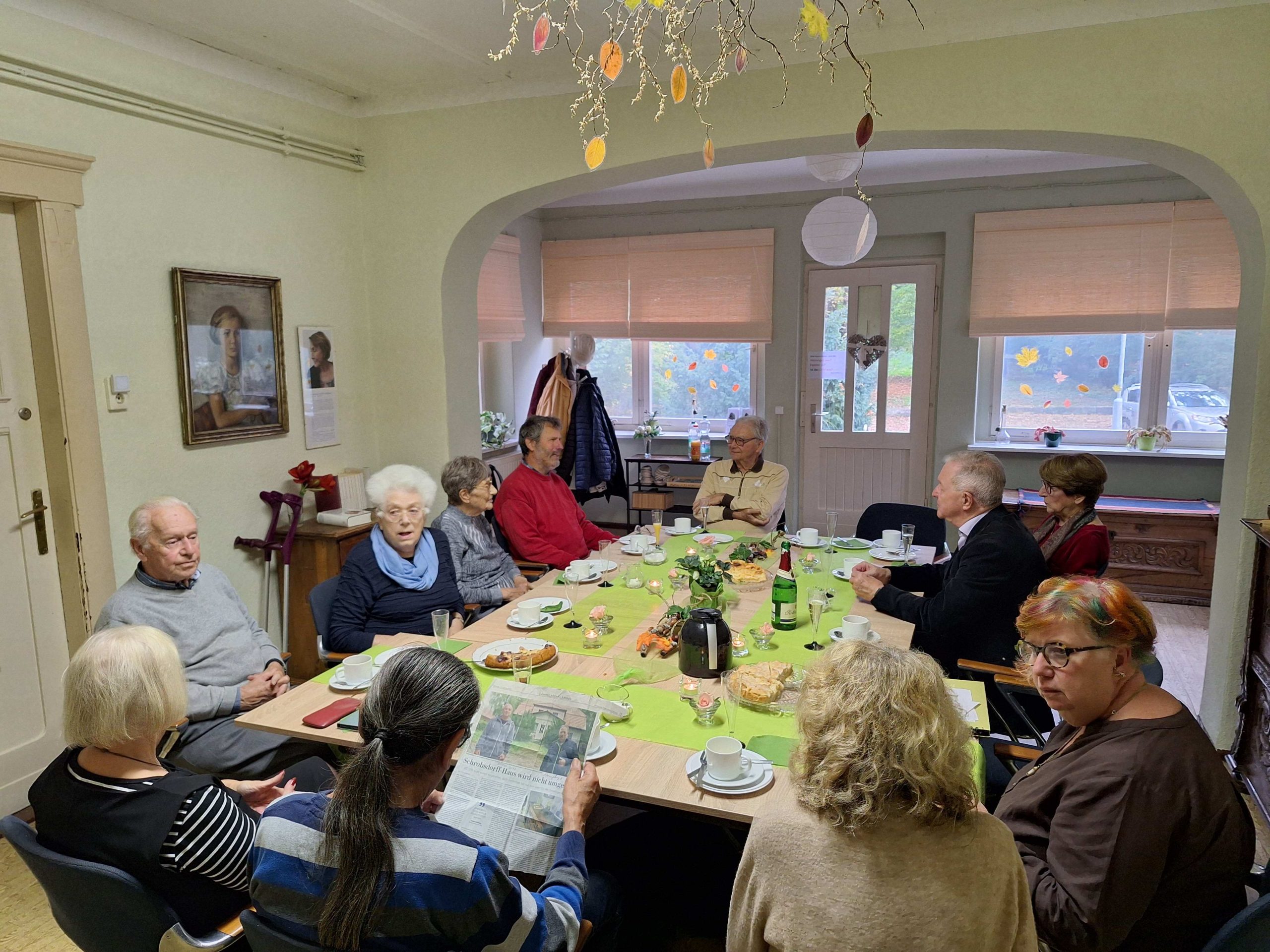 Am 22. Oktober 2025, 10 Tage nachdem der Heimatverein Pätz e.V. die von ihm gestiftete Gedenk-Stele für Angelika Schrobsdorff eingeweiht hatte, kam lieber Besuch in den Hörningweg. Peter Schrobsdorff, der Sohn der Schriftstellerin, besuchte uns im zukünftigen Dorfgemeinschaftshaus, dem Sommersitz seiner Vorfahren. Da er am 11.10. bei der Enthüllung der Stele leider verhindert war, holten wir die Feierlichkeit im kleineren Kreis nach. Zu den Gästen an der Kaffeetafel gehörten Peter Schrobsdorff, Siegrid und Dr. Jürgen Scheibe, Brigitte und Klaus Lehmann-Dreistadt, sowie drei Mitglieder des Heimatvereins. Zudem kamen noch vier Überraschungsgäste aus Klausdorf. Schnell kamen alle bei Kaffee und selbstgebackenem Kuchen in einen interessanten Austausch, bei dem nicht nur Literatur das Thema war.