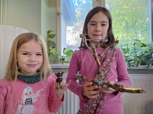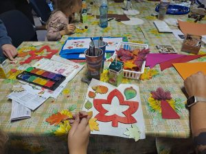 Nun wurde mit Schere, Seitenschneider, Pappe, Klebepistolen und Draht gewerkelt! Wir hatten einige Bastelsätze vorbereitet. Am beliebtesten war allerdings das freie Basteln mit Naturmaterialien, nicht nur bei den Kindern. Es entstanden tolle Mobiles mit Blättern, Kienäpfeln, Federn, Eicheln und anderem. Kastanienfiguren, z.B. ein Motorrad und ein Einhorn, waren natürlich ein Muss. Bunte Drachen und Fensterbilder wurden kreiert. Zum Lampionumzug am 31. Oktober können zudem einige neue Laternen bewundert werden. Nach drei Stunden schloss unsere Bastelwerkstatt. In dieser Zeit hatten uns ca. 20 Kinder zwischen 2 und 10 Jahren mit ihren Begleitungen besucht und konnten später ihre Kunstwerke stolz und zufrieden nach Hause tragen. Zum Glück kamen unsere Gäste zeitlich versetzt, sonst hätte es unsere räumlichen Kapazitäten gesprengt. Wir freuen uns über das Interesse der Kinder an kreativer Betätigung und laden deshalb zum Plätzchenbacken ein. Der genaue Termin kann den Aushängen entnommen werden.