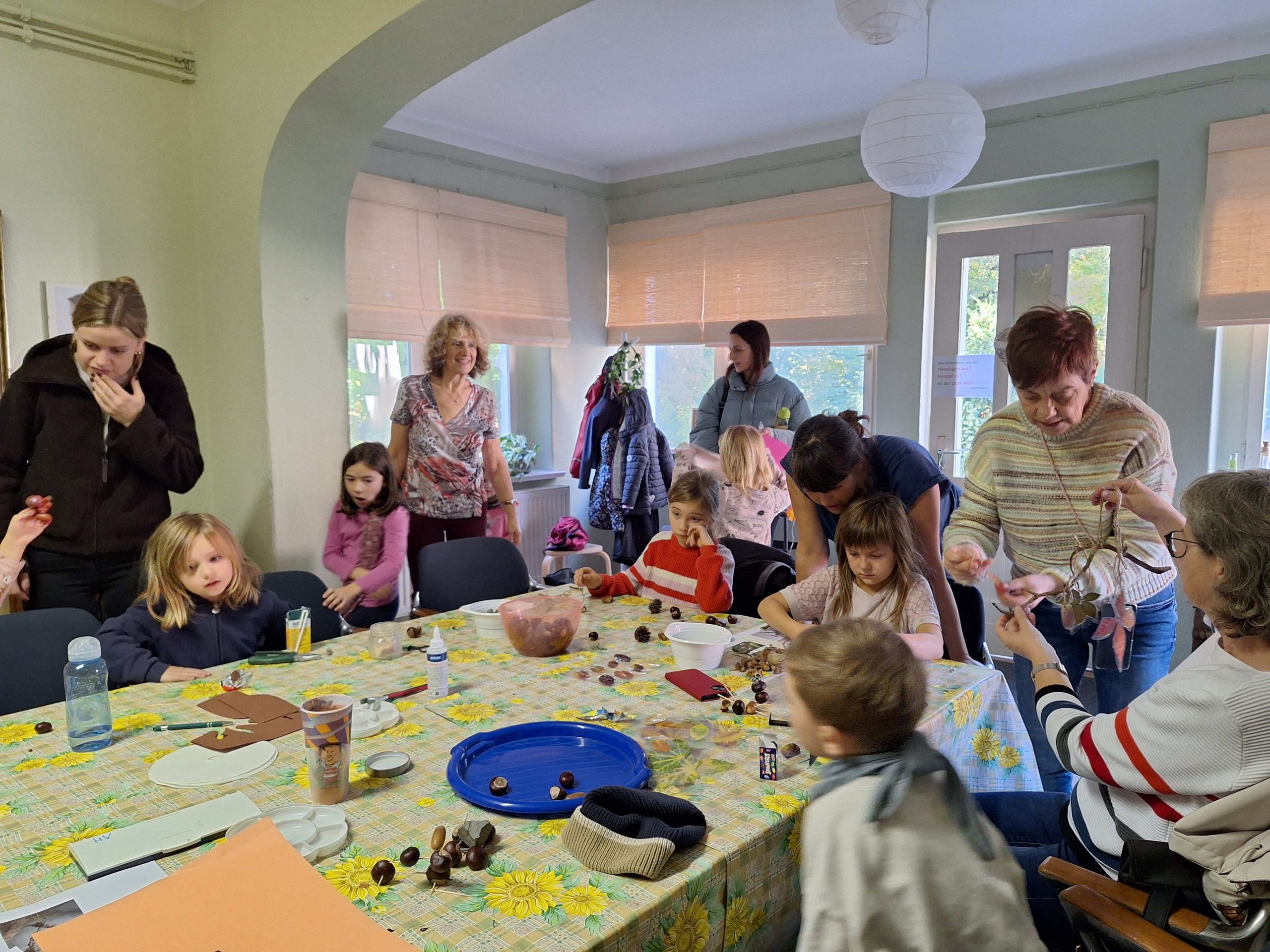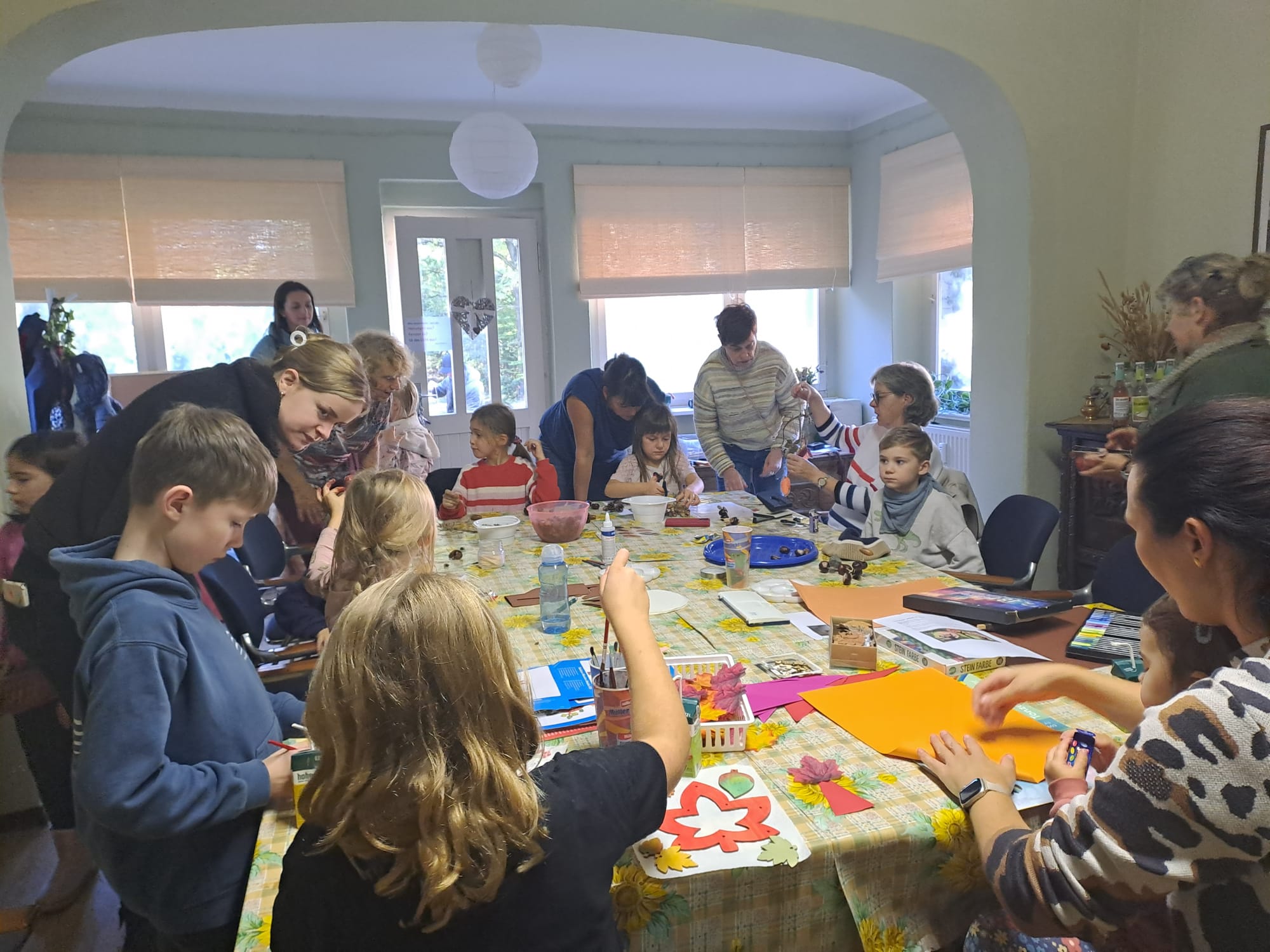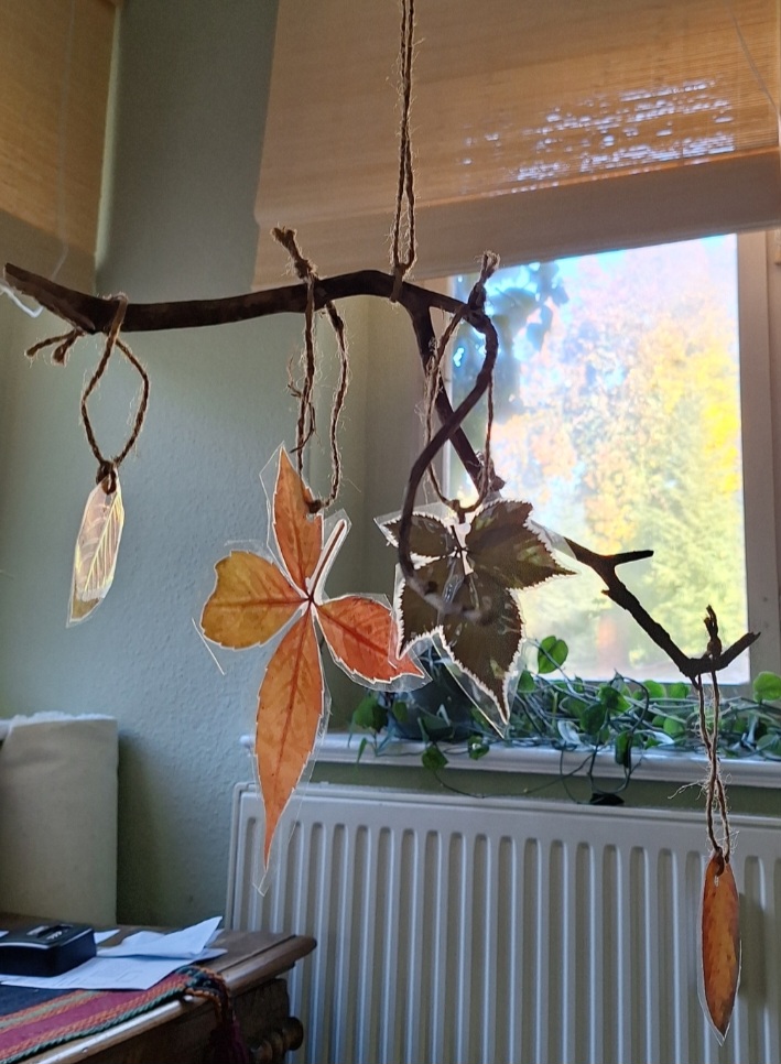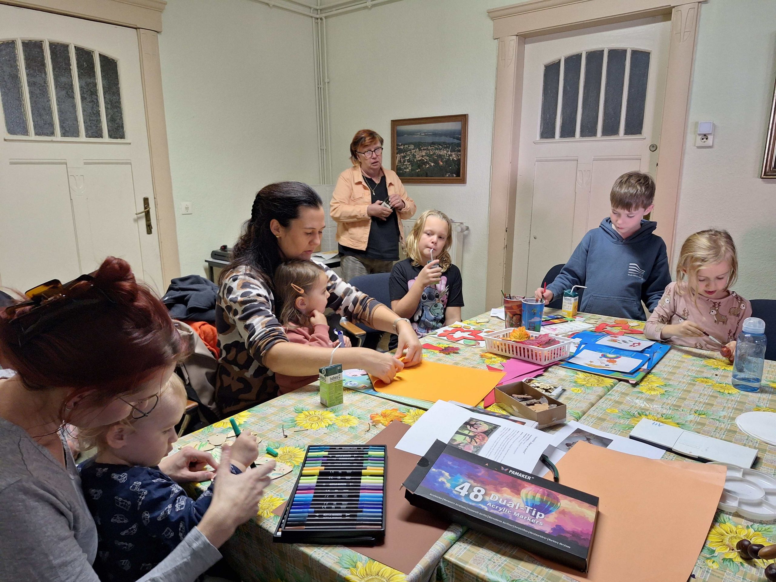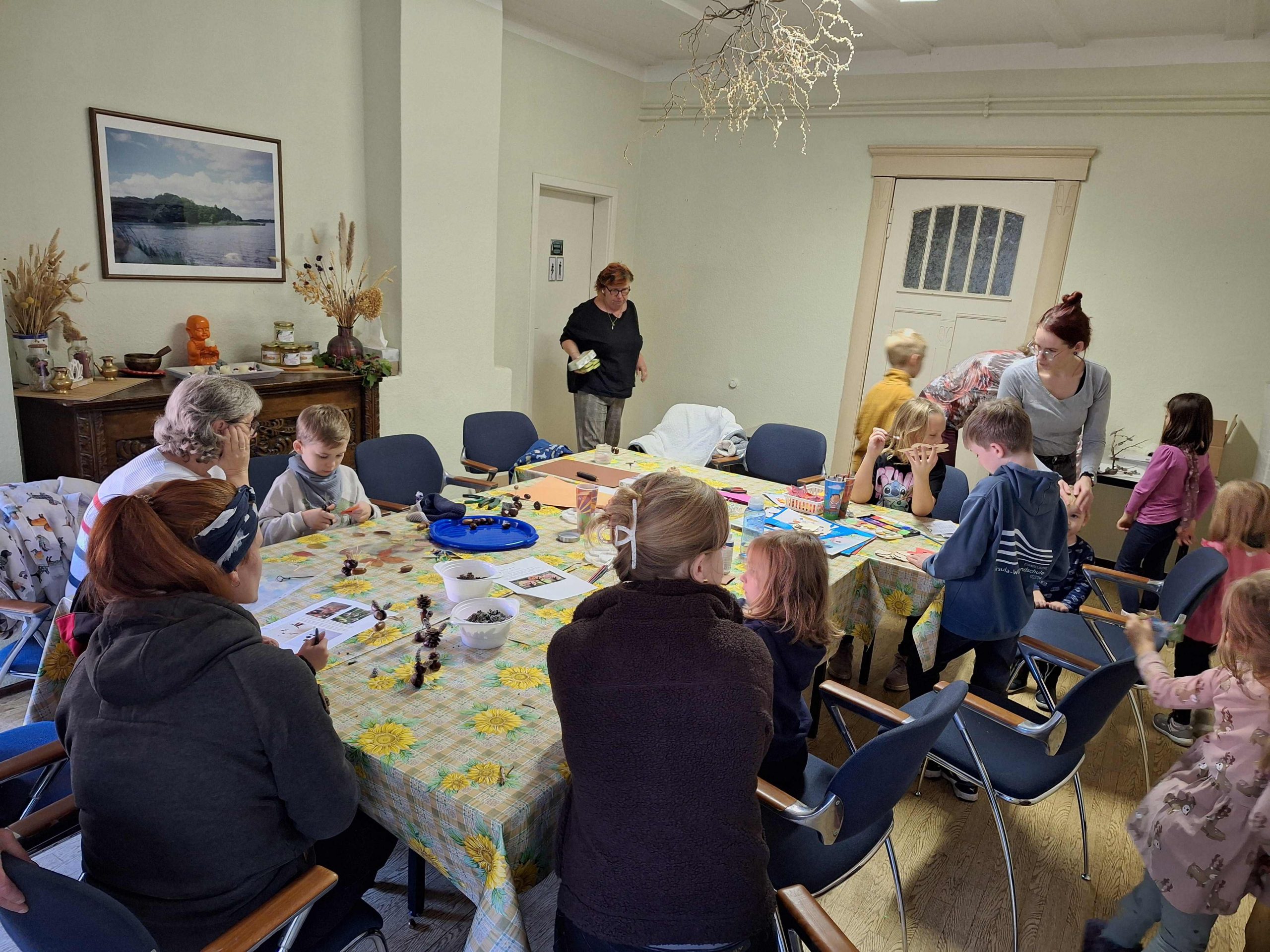 Nun wurde mit Schere, Seitenschneider, Pappe, Klebepistolen und Draht gewerkelt! Wir hatten einige Bastelsätze vorbereitet. Am beliebtesten war allerdings das freie Basteln mit Naturmaterialien, nicht nur bei den Kindern. Es entstanden tolle Mobiles mit Blättern, Kienäpfeln, Federn, Eicheln und anderem. Kastanienfiguren, z.B. ein Motorrad und ein Einhorn, waren natürlich ein Muss. Bunte Drachen und Fensterbilder wurden kreiert. Zum Lampionumzug am 31. Oktober können zudem einige neue Laternen bewundert werden. Nach drei Stunden schloss unsere Bastelwerkstatt. In dieser Zeit hatten uns ca. 20 Kinder zwischen 2 und 10 Jahren mit ihren Begleitungen besucht und konnten später ihre Kunstwerke stolz und zufrieden nach Hause tragen. Zum Glück kamen unsere Gäste zeitlich versetzt, sonst hätte es unsere räumlichen Kapazitäten gesprengt. Wir freuen uns über das Interesse der Kinder an kreativer Betätigung und laden deshalb zum Plätzchenbacken ein. Der genaue Termin kann den Aushängen entnommen werden.