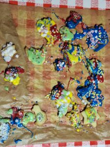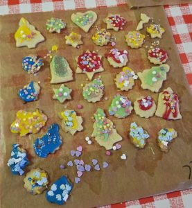 Die Kinder saßen im Hauptraum, bekamen Schürzen um und einen Klops Teig in die Hand und schon ging es los! Natürlich waren auch die Eltern als Hilfen an ihrer Seite beim Ausrollen, Ausstechen und Verzieren nach dem Backen. Schön ist ja, dass misslungene Kunstwerke, anders als beim Basteln, einfach aufgegessen werden. Jede Familie ging mit einer gut gefüllten Dose wohlschmeckender und hübsch aussehender Kekse nach Hause.