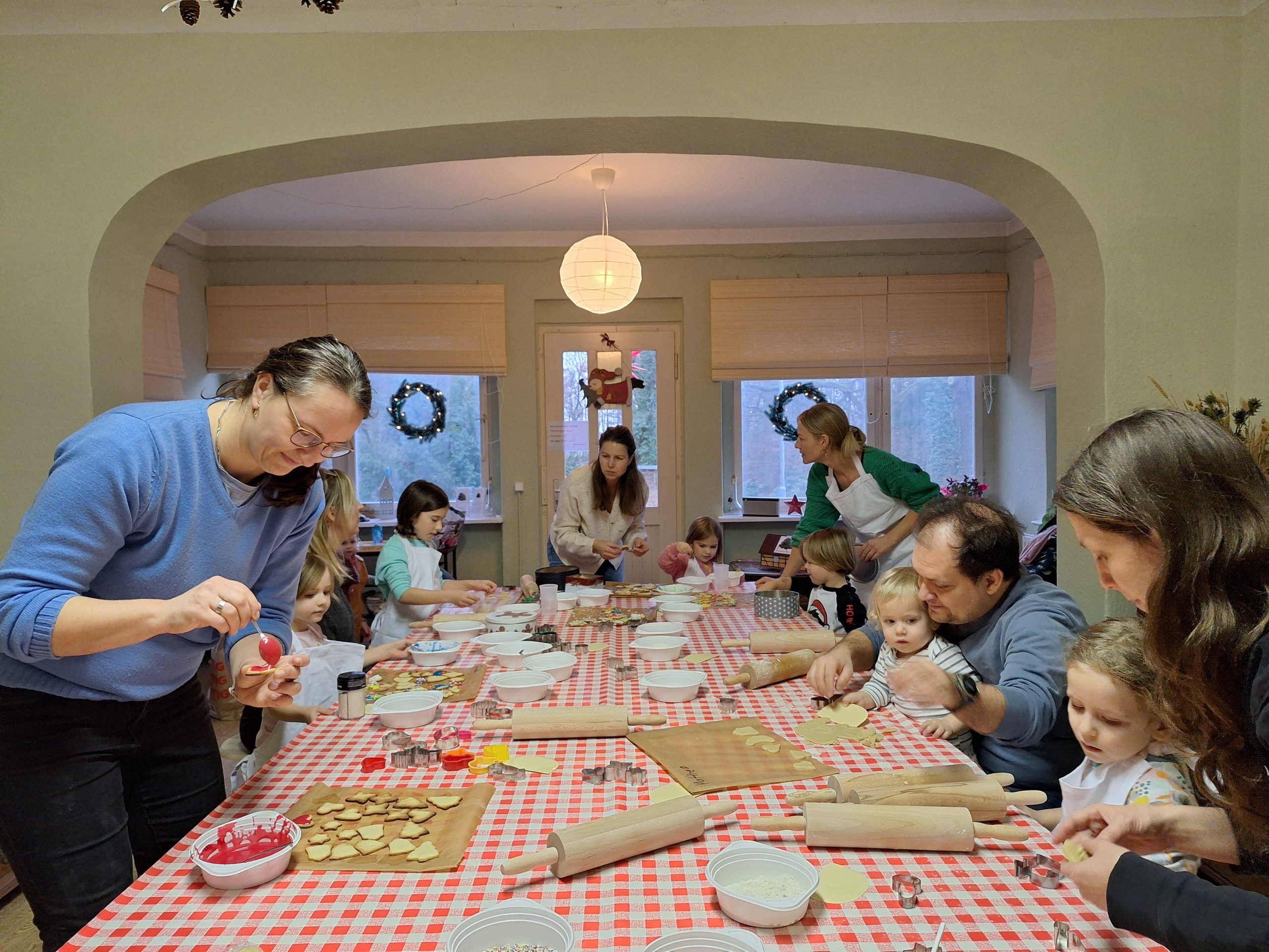Die Kinder saßen im Hauptraum, bekamen Schürzen um und einen Klops Teig in die Hand und schon ging es los! Natürlich waren auch die Eltern als Hilfen an ihrer Seite beim Ausrollen, Ausstechen und Verzieren nach dem Backen. Schön ist ja, dass misslungene Kunstwerke, anders als beim Basteln, einfach aufgegessen werden. Jede Familie ging mit einer gut gefüllten Dose wohlschmeckender und hübsch aussehender Kekse nach Hause.